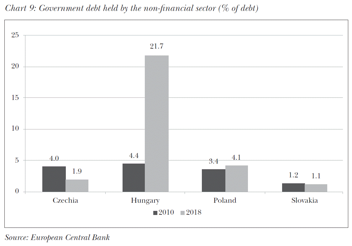 In summary, among the countries of the region in Czechia, Poland and Slovakia, exposure to the third original sin increased between 2010 and 2018. In the case of the latter two, foreign owners had the majority of government debt. In contrast, domestic financing has become a core strategy in Hungary: with the involvement of household investors, government decision-makers have succeeded in getting foreign funding into the minority in public debt. However, the government is planning further advances: in the next 5 years in order to fully replace foreign financing, efforts are made at doubling the stock of household government securities (Kuti and Koroknai, 2019).