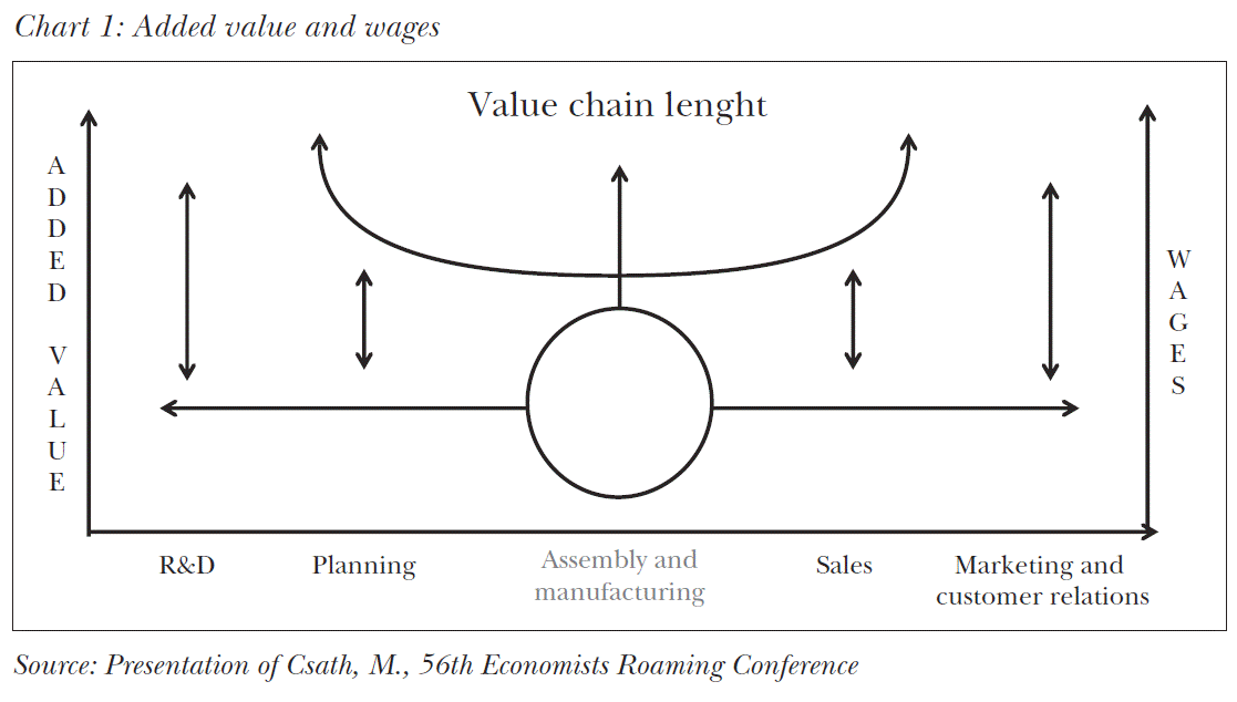One of the most important factors of economic growth and increased corporate competitiveness is human capital, which affects economy through the number and the skill level of the workforce alike. To improve competitiveness, increasing employment rate is not enough tough, it requires the expansion of workplaces that generate higher added value, which is difficult to achieve without the existence of knowledge-based society. This all means that businesses that are capable of generating higher added value need highly skilled workforce. The link between added value and wages is demonstrated by the value chain below (Chart 1). Hungary, at present, instead of generating added value, is still at the stage of building on assembly and manufacturing. Increasing productivity and efficiency, however, calls for opening towards innovative activities.