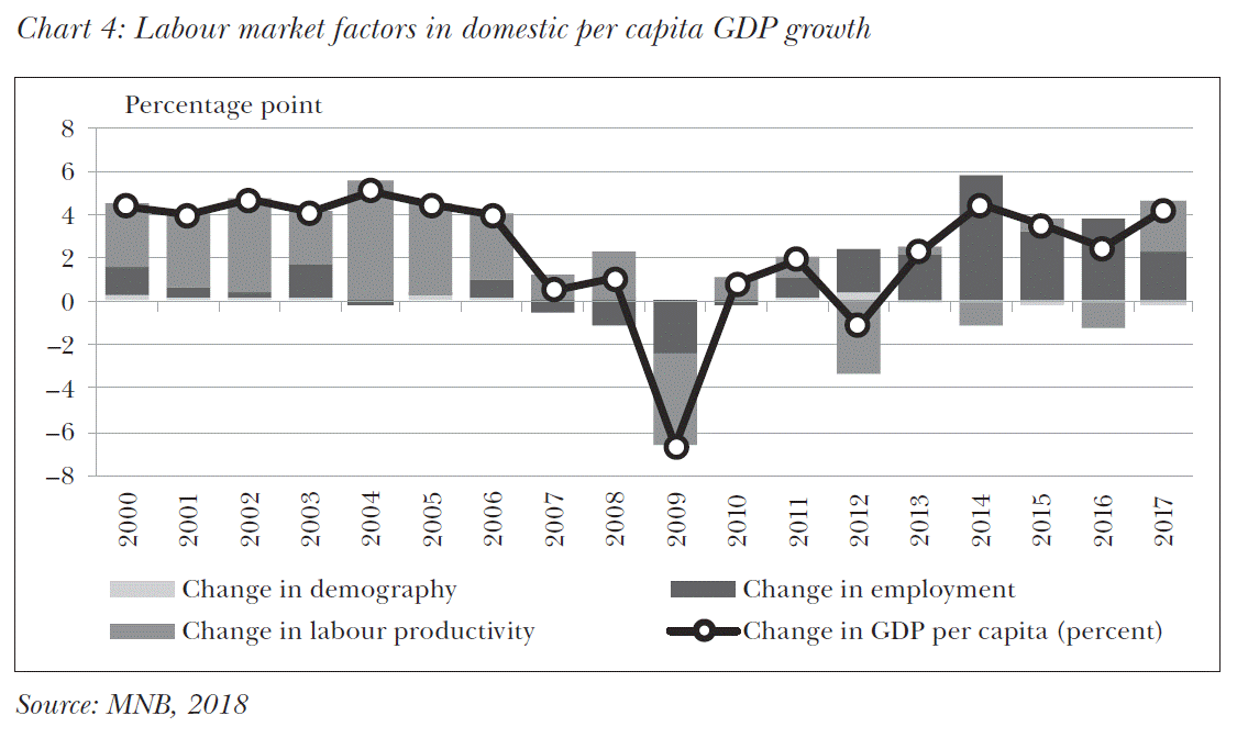 Human capital has a major effect on economic growth and improved corporate competitiveness; firstly, by means of quantitative change (staff increase), secondly, by means of quality change (higher skills). The MNB publication Growth Report (2018) shows – analysing 2010–2017 EU data – that employment rate increase and per capita GDP changes have a positive relationship. In Hungary rates for the 15–74 year-old population increased by 10% point; thus per capita GDP grew almost by 20% by 2017. The Chart 3 shows employment and per capita GDP changes in EU countries.