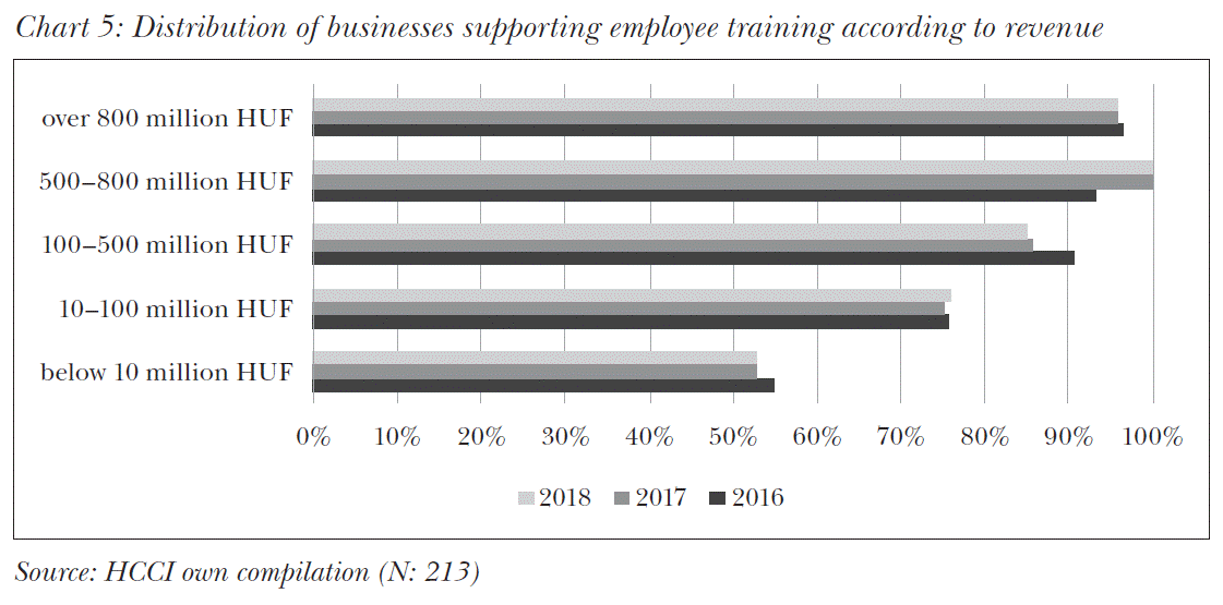 The possible reasons for this could be that the company operation requires employees taking part in short and more targeted training, or, if an employee with higher skills is needed, they prefer hiring new adequately qualified employees instead of enrolling existing workforce. It also has to be noted that in several companies there is a perceivable lack of consciously designed human resources strategy, which could help them choose the most fitting form of training for a certain job, employee or task.