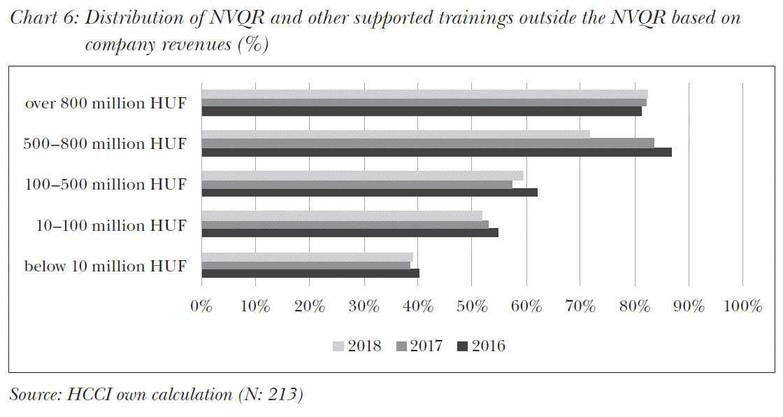 The level of training refers to (1) own internal training, (2) state-recognised trainings in the National Vocational Qualification Register (NVQR) and/or other supported trainings outside the NVQR, and (3) higher education. In terms of training level, in the past 3 years 81% of participating companies supported state-recognised trainings in the NVQR and other supported trainings outside the NVQR, 71% supported internal professional trainings, whereas 51% supported higher educational training (college/ university). Training levels were examined in connection with company size (number of staff) to see different training type preferences for different sizes. In this respect, a high percentage of companies with smaller than 50 and larger than 100 staff supported NVQR training, while companies with 50-100 staff preferred internal training, but they supported NVQR trainings as well. Higher educational programmes (college/univer-sity) were mostly preferred by companies having more than 250 workers; however, for this size – similarly to other company sizes – NVQR trainings were still prevalent.