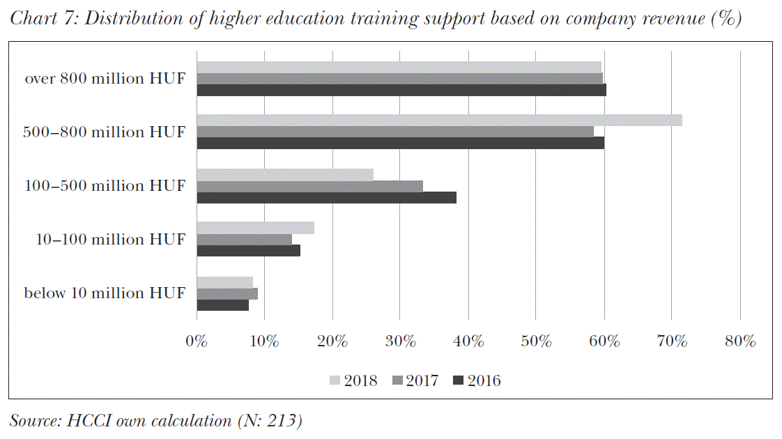 Besides NVQR trainings higher education support is also significant, therefore, we also looked at the revenue factor for this training type. In the examined period two revenue categories show greater change in supporting employees’ college and/or university education. Support for this type of education has significantly grown in companies with 500–800 million HUF revenue, while in companies with 100–500 million HUF revenue, support for this type of education has decreased (Chart 7).