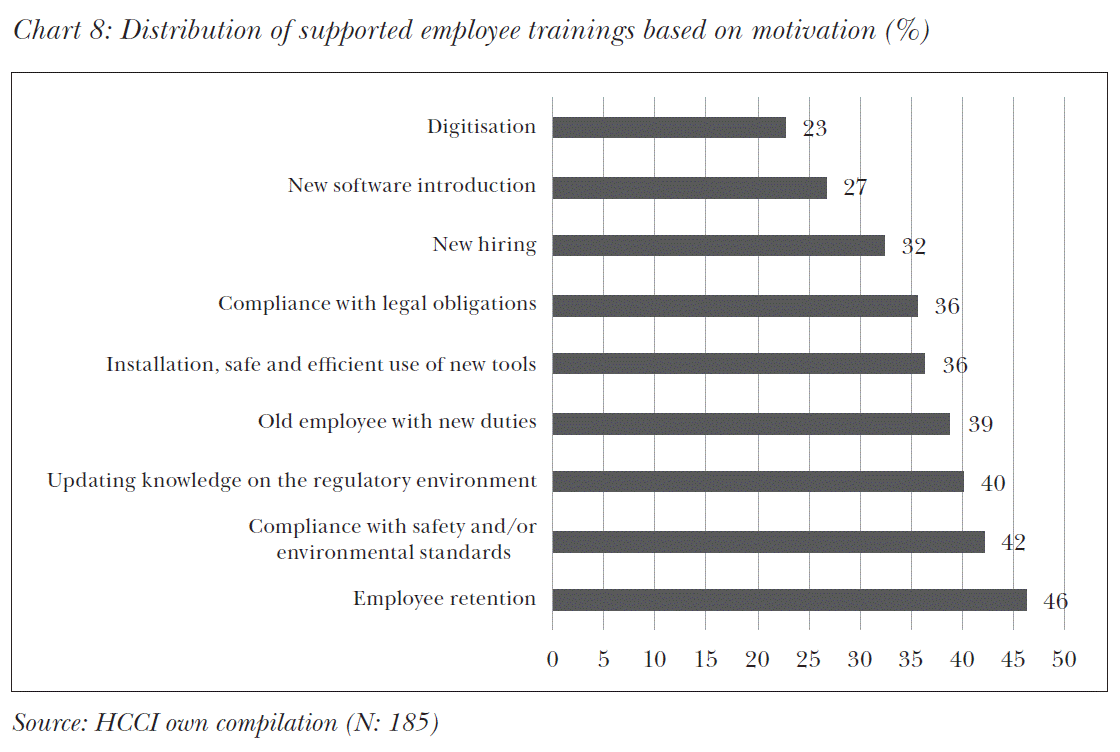 Taking a look at the aims of supported employee trainings, it can be concluded that the most important aim is employee retention, which is followed by compliance with safety and/or environmental standards, and updating knowledge on regulatory environment (see Chart 8). It is a surprising finding that the least important motivation for supporting employee trainings is digital competences development (digitisation).