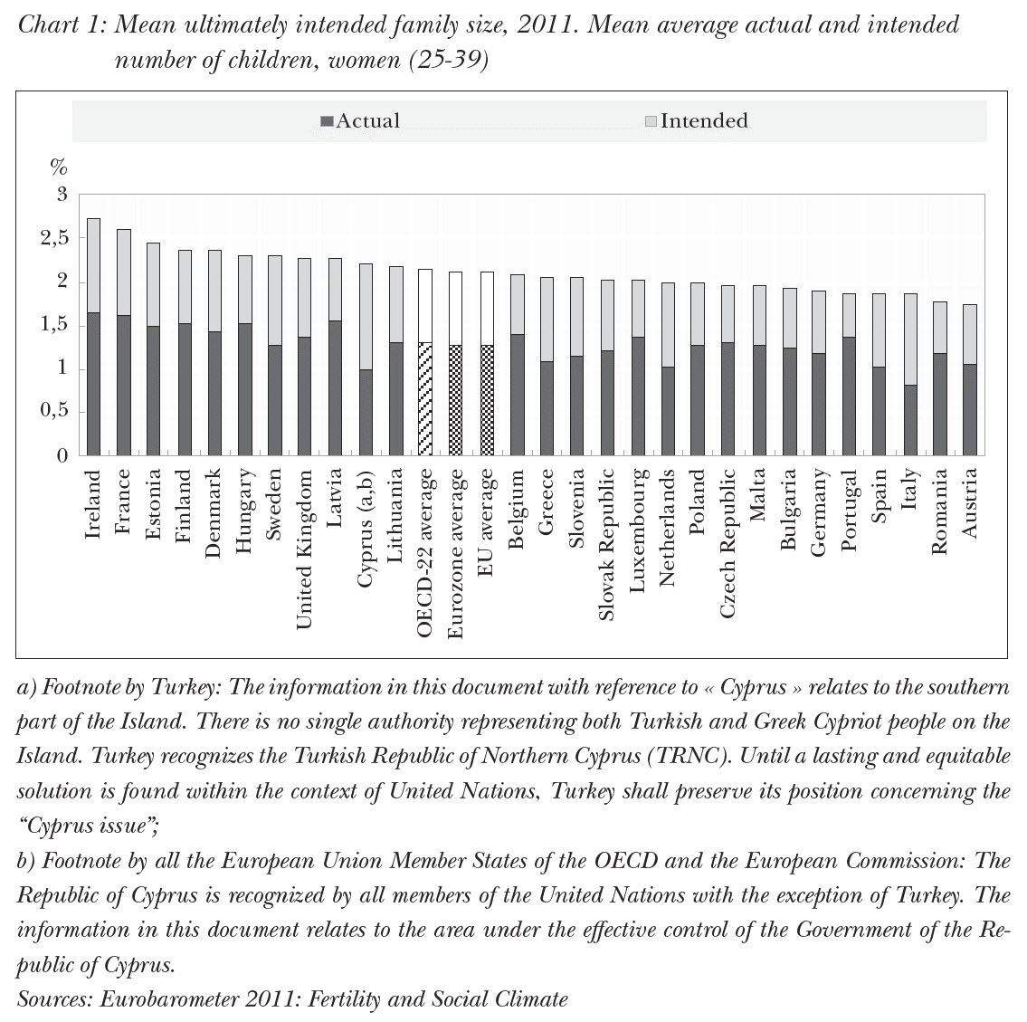 What happened at the level of families? As we know, in most European countries parenting remains considerably below the reproduction requirement. These are facts that show the actual number of children born. This is an important indicator. However, it is also important to look beyond the indicators. This is what an OECD study did: it compared the intended number of children and the number of children actually born to mothers between 24 and 49 years of age. This test revealed a significant difference between the intended number of children and the number of actually born children. This is conspicuous because these statements were not dim future concepts, they were made by people who were actual parents, and so the intended number was based on experience. In their case the intended number of children should have been close to implementation, however, this was not what happened. The OECD study considered it as an important warning that the desired number of children is considerably below the actual number of children suggests that childbearing (starting a family) is hampered in OECD countries.