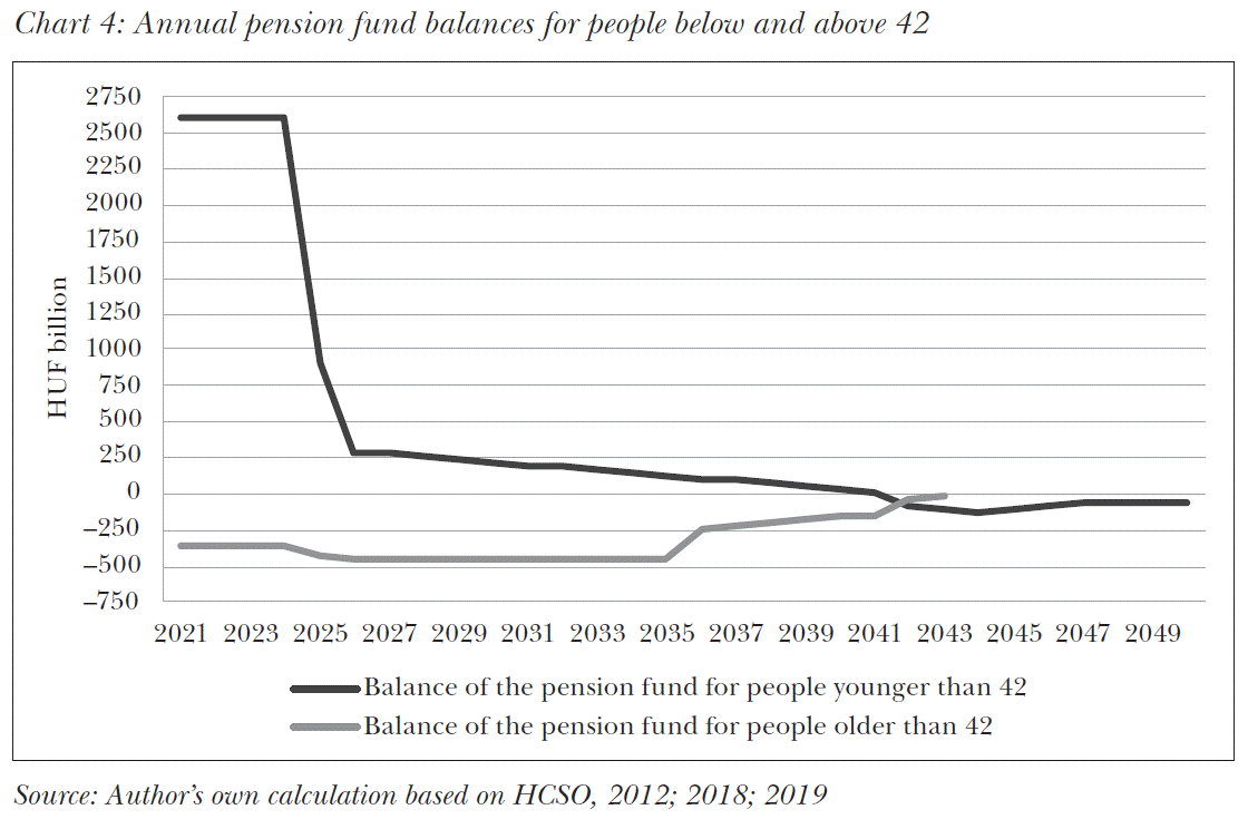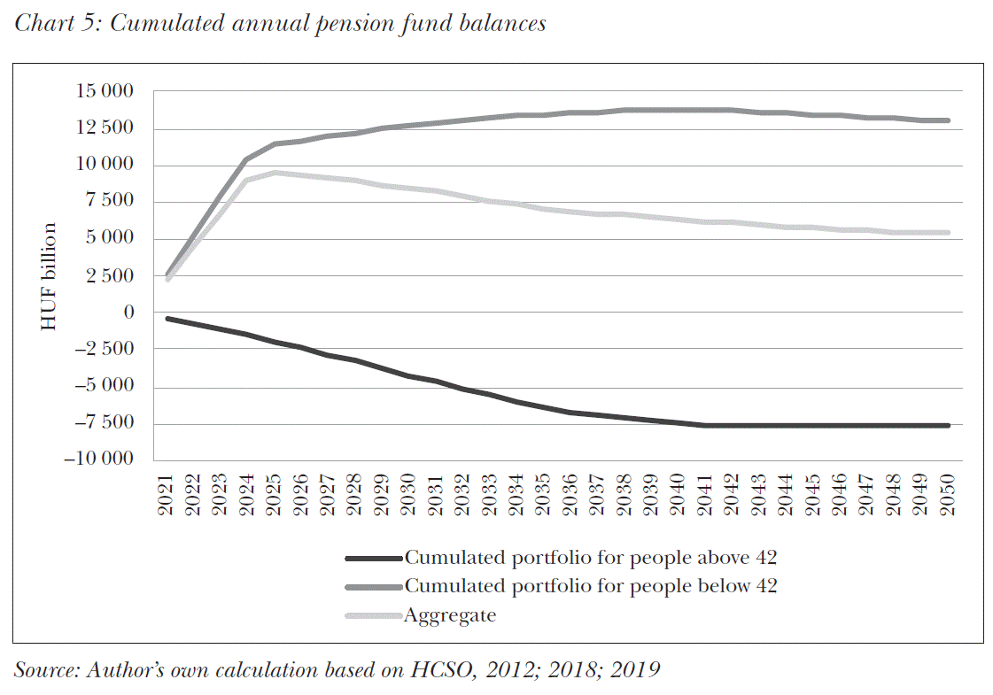 The chart reveals that while the pension fund surplus increases to HUF 13,000 billion, the government will have a deficit in the amount of HUF 7.7 billion from uncovered payments. This means that actually, such accumulated amounts should be expected when a financing facility is set up between the two pension funds. The government could issue bonds for this accumulated deficit and the child-to-parent pension fund could purchase such bonds.