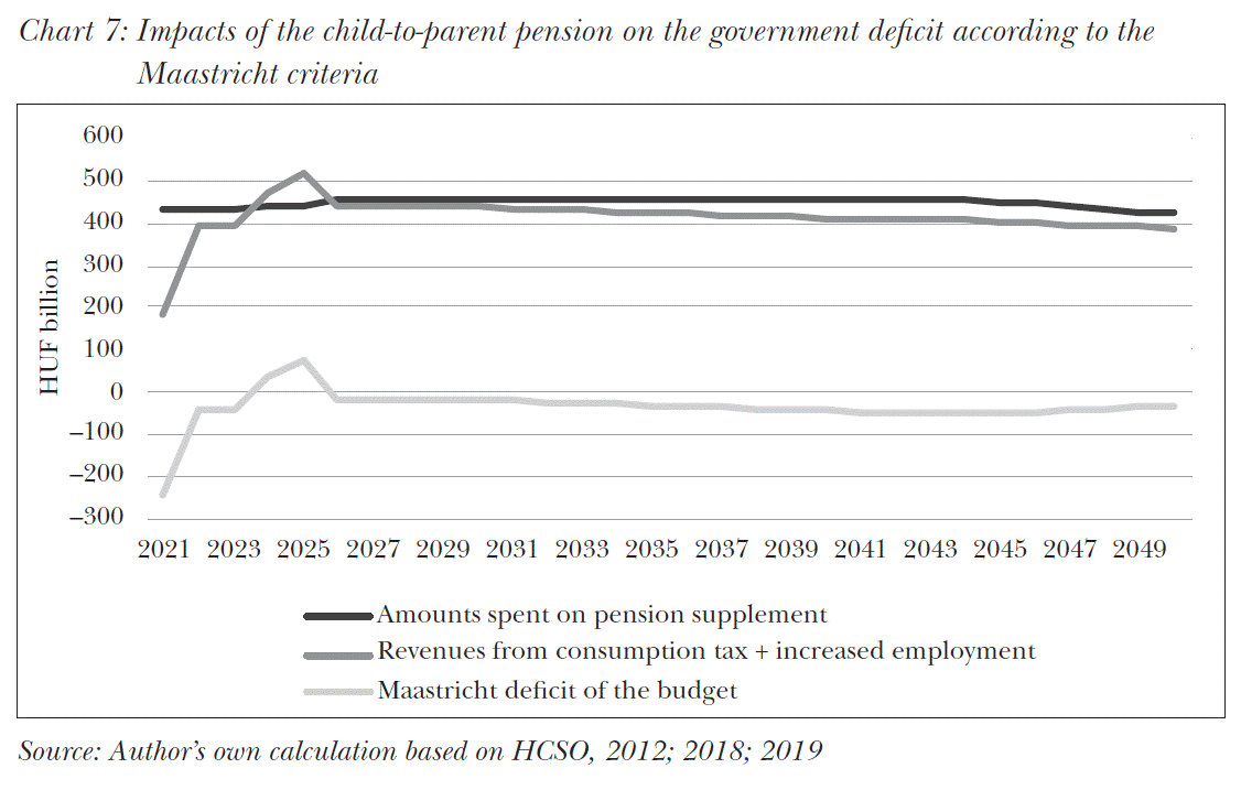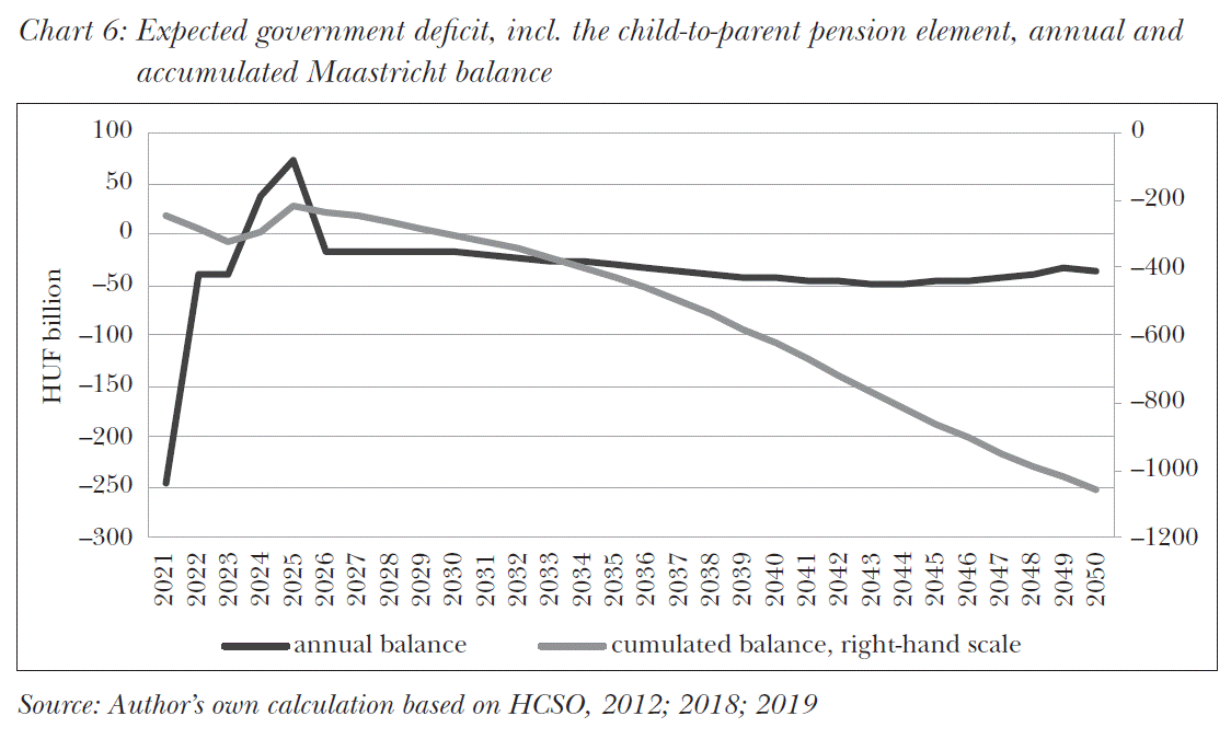 The obvious fiscal burden is, however, mitigated by the approach that the proposed model considers childbearing an investment that will subsequently reduce the demographic deficit. This also supports the actual birth of the number of intended children, since it makes obvious for everyone that an investment is made into his or her family’s future. In our opinion, the proposed child-to-parent pension element also improves the accounting of the pension scheme, not in the lease due to the fund financing technique that also takes account of resources. Similarly important is the approximation of accounting and social values.