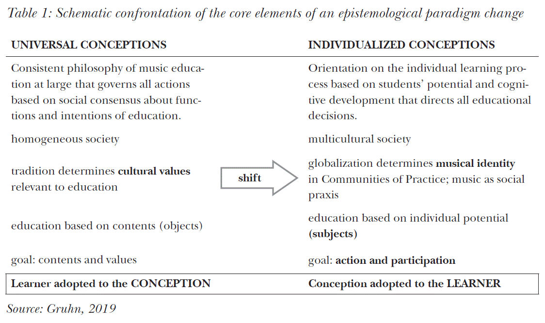 According to Gruhn (2019), the present situation of music teaching and learning is also characterised by a socially and culturally determined shift from the objects of education to its subjects, from content to action and from the orientation on traditional values of artworks to an understanding of music as action in social praxis that offers the possibility of participation rather than calling for factual knowledge (Table 1).