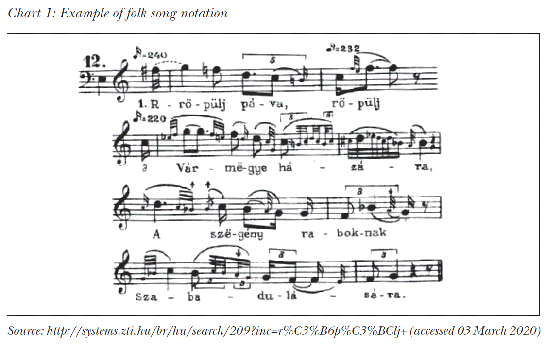 Many of Kodály’s children’s choruses are based on Hungarian folk songs, like the first one from 1925, when Kodály’s interest turned towards music education (Villő / Straw Guy’ and Túrót eszik a cigány / See the gipsy munching cottage cheese). Kodály believed that every ethnicity has a suitable body of folk songs for teaching music, so it should be simple to use folk songs in the national core curriculum. However, very few ethnicities have experts like Kodály, who invest in the pedagogical elaboration of their cultural heritage. The composers Zoltán Kodály and Béla Bartók were also collectors of folk songs, and their experiences in the field of ethnomusicology inspired their compositional work. According to Kodály’s observations, folk tunes do not only have a single authentic form to be adhered to note by note. The type, which is a certain kind of frame including the structure, is more important than a single variant. The reason for giving an outstanding role to folk songs in Hungarian music education is that a series of important musical phenomena belongs to the basis of musical thinking, and they are the easiest learnt in folk music. Folk songs can be read with text or with sol-fa. Many songs are richly decorated, and at higher levels students need to be taught to read decorations (Chart 1).