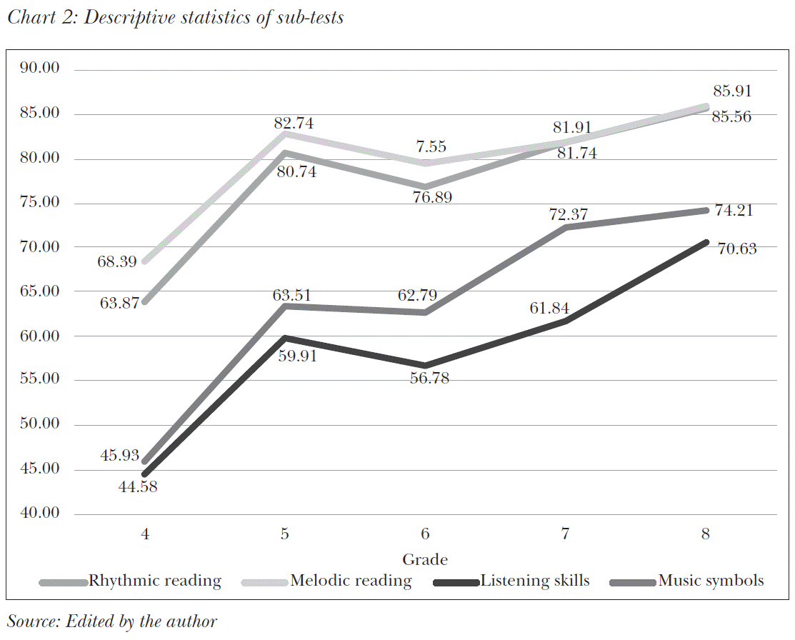 In terms of difficulty, the test corresponds to the development level of the grades assessed. The students’ achievement was 73 per cent, with a standard deviation of 12.35. According to the results of variance analysis (F=4.206, p=0.007), significant differences were found between sixth and eighth graders, evidencing that music literacy skills improve in these grades.