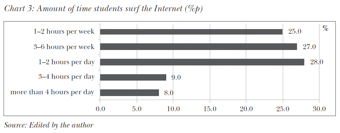 We were curious about students’ use of digital technologies at home in this rapidly developing world. Nowadays, the Internet plays an important role in teaching, research and learning processes, as it is the only and the most powerful tool to provide access to unlimited information. We asked how often students surfed the Internet. 25 per cent reported that they used it 2-3 hours a week, and nearly 30 per cent claimed that they used the Internet 1-2 hours every day. Less than 10 percent of the students reported that they used it more than 4 hours a day (Chart 3).