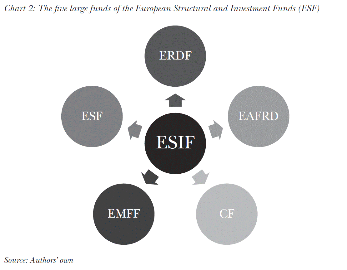 Hungary receives most EU grants from cohesion policy funds, while the amount of resources provided to the country from central EU programmes is low. The basis of strategic planning for the cohesion policy for the period between 2014 and 2020 includes the Europe 2020 strategy, which determines the objectives of the European Union, providing support for the decentralized EU programmes from the below-mentioned five large funds within the European Structural and Investments Funds (ESF) (Chart 2).
