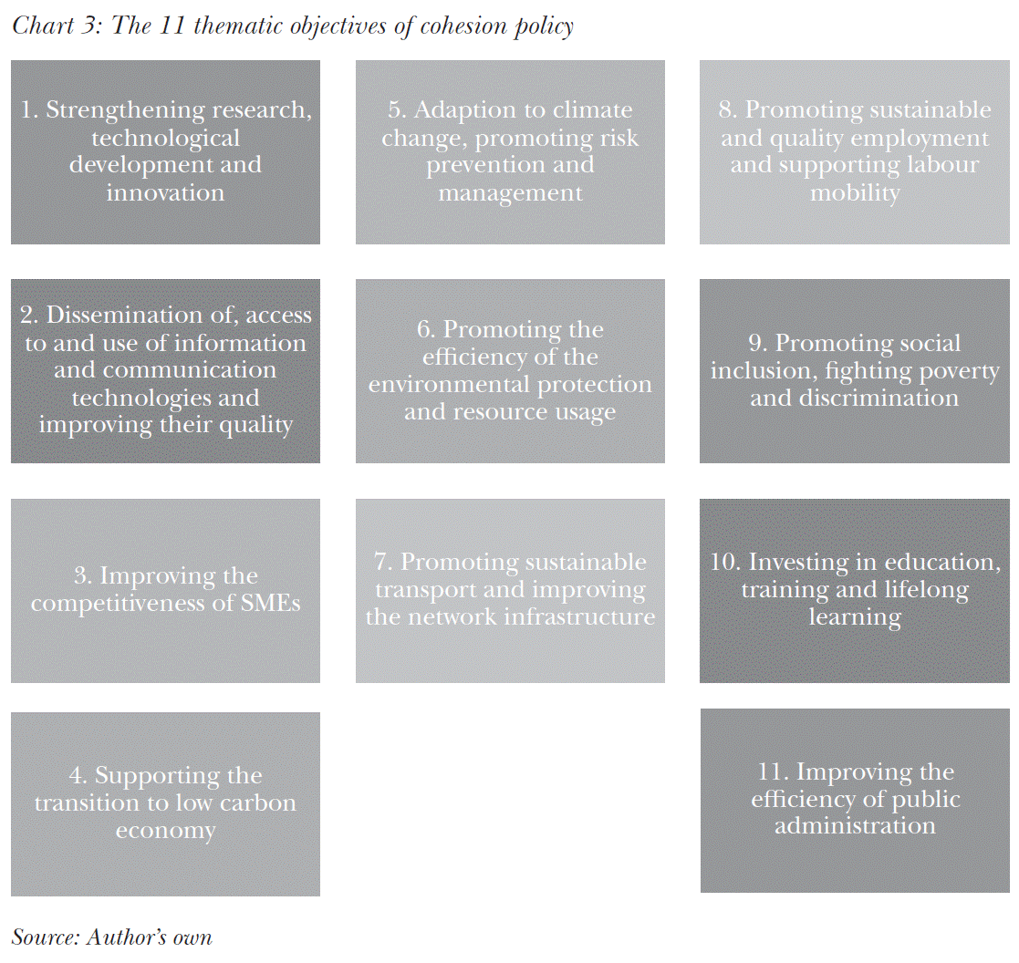 The regional policy of the European Union (Chart 3) has 11 thematic objectives for the programming period of 2014–2020. The investments of the European Regional Development Fund support all the 11 objectives, but the main priorities of the investments are set out in sections 1–4. The main priorities of the European Social Fund are objectives 8–11, but it also supports objectives 1–4. The Cohesion Fund supports the objectives 4–7 and objective 11.