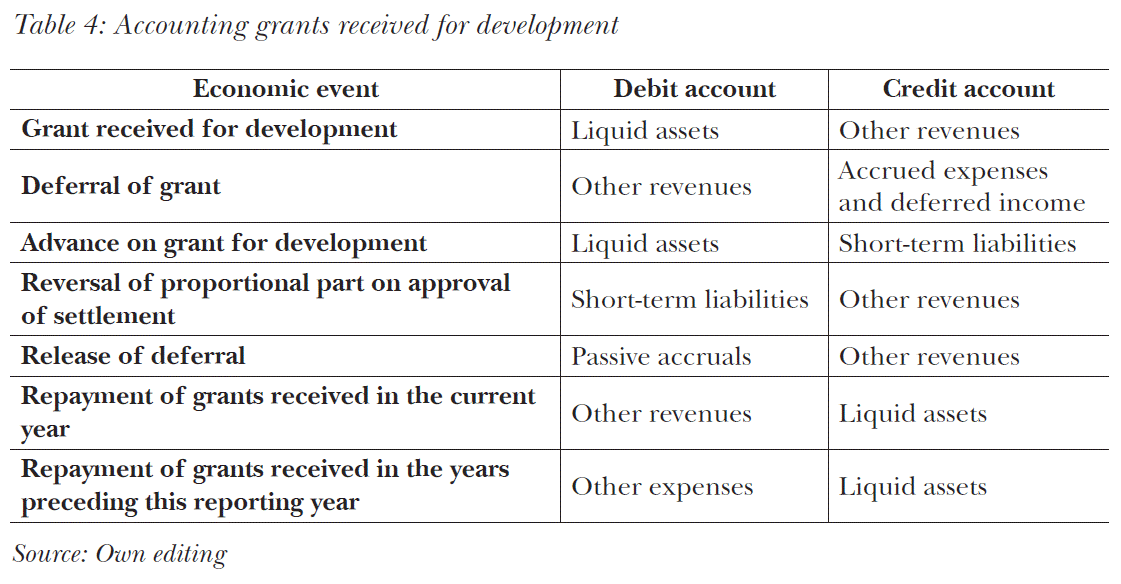 For accounting, the classification based on the objectives of the grants is relevant because non-refundable grants received for offsetting costs (expenses), non-refundable grants for development objectives and grants to be placed in the capital reserve are recognised differently. The grants received for operating purposes are either support granted for activities not profitable under market conditions or for outsourcing state and local government tasks. Table 3 shows the accounting of grants received for operating purposes.