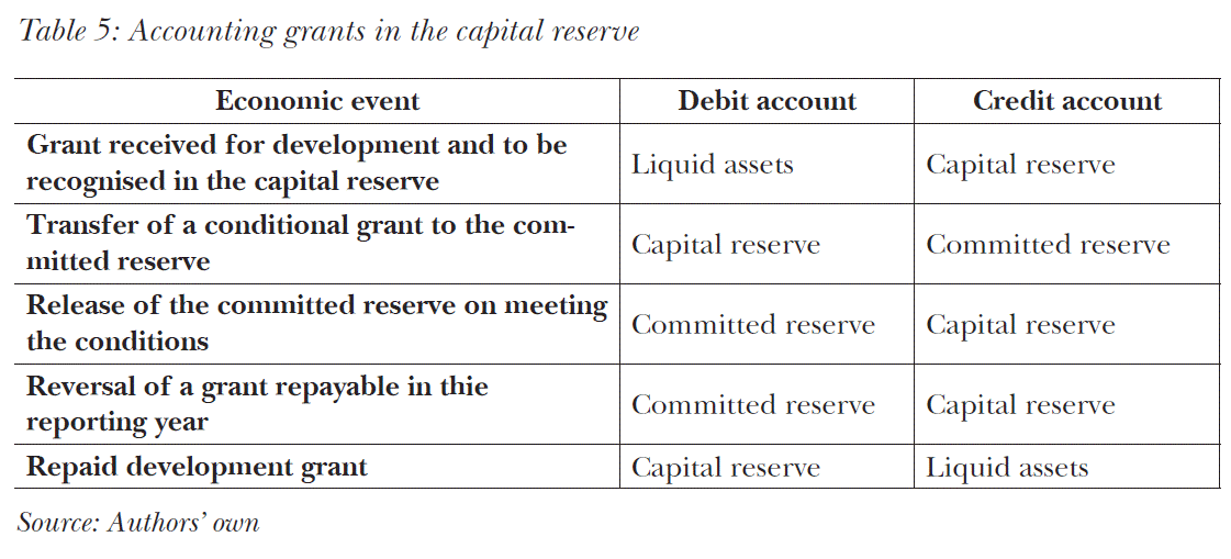Support granted to the credit of capital reserves affect a relatively narrow circle. Grants received from public appropriations can be recognised in the capital reserve if this is what the grant contract expressly stipulates. These grants must be accounted as equity in the capital reserve simultaneously with the cash flow, and a reserve must be set aside at the time of accounting. These grants cannot be recognised as income. Disbursement of the grant is conditional, the committed reserve must be terminated at the pace and rate the grant is implemented. Grant accounting is detailed in Table 5.
